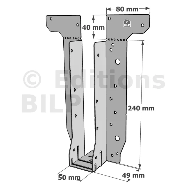 - Étrier fourni avec ses brides supérieures droites, pliables sur chantier afin de s’adapter à toutes les hauteurs de solives,