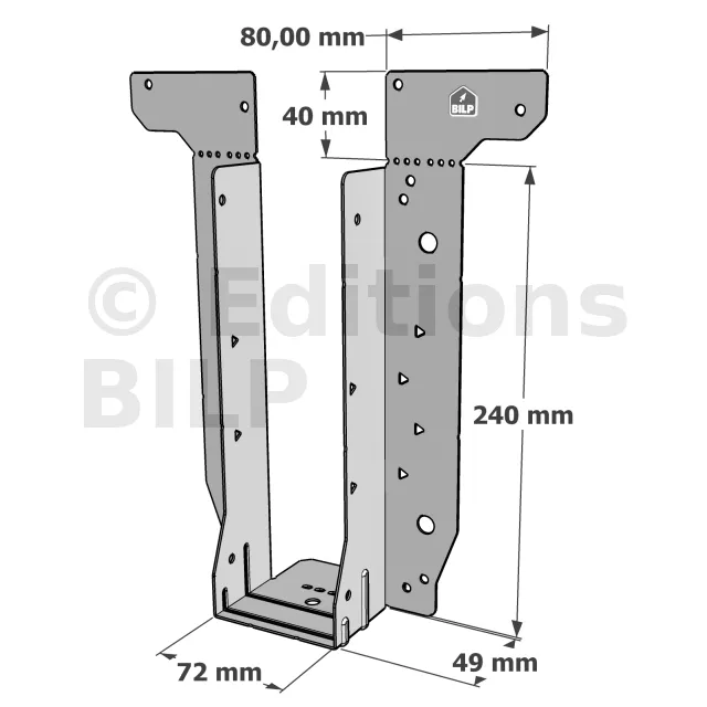 - Étrier fourni avec ses brides supérieures droites, pliables sur chantier afin de s’adapter à toutes les hauteurs de solives,