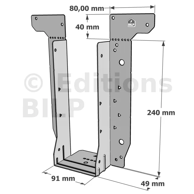 - Étrier fourni avec ses brides supérieures droites, pliables sur chantier afin de s’adapter à toutes les hauteurs de solives,