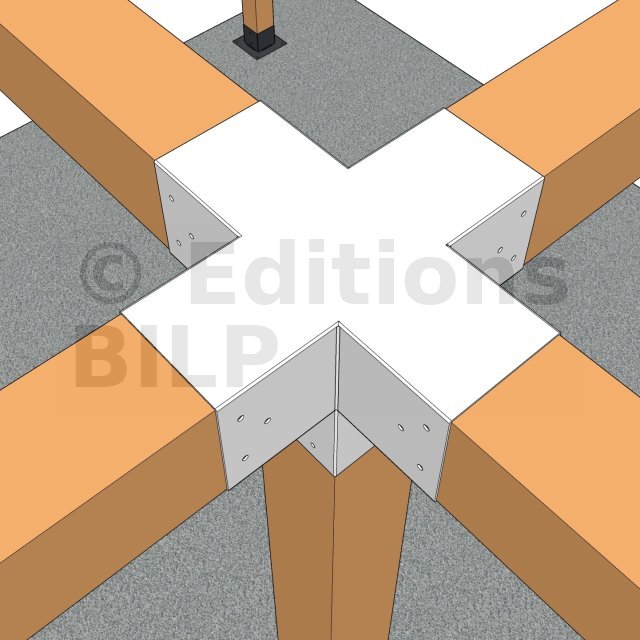 Il permet de raccorder deux poutres 120x120mm perpendiculairement à une autre poutre 120x120mm, le tout étant supporté par un poteau vertical de 120x120mm.