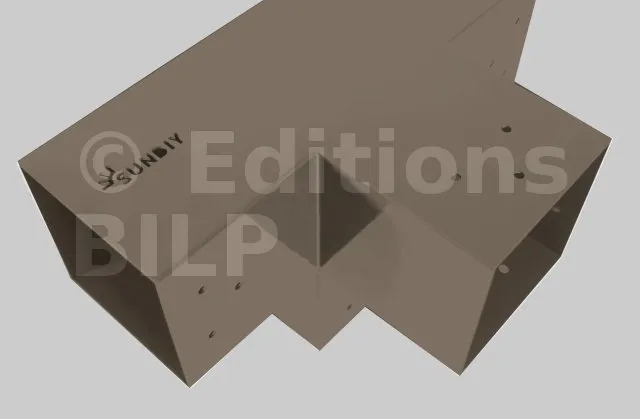 Il permet de raccorder une poutre de 120x120mm perpendiculairement à un chevron de 120x120mm, le tout étant supporté par un poteau vertical de 120x120mm.