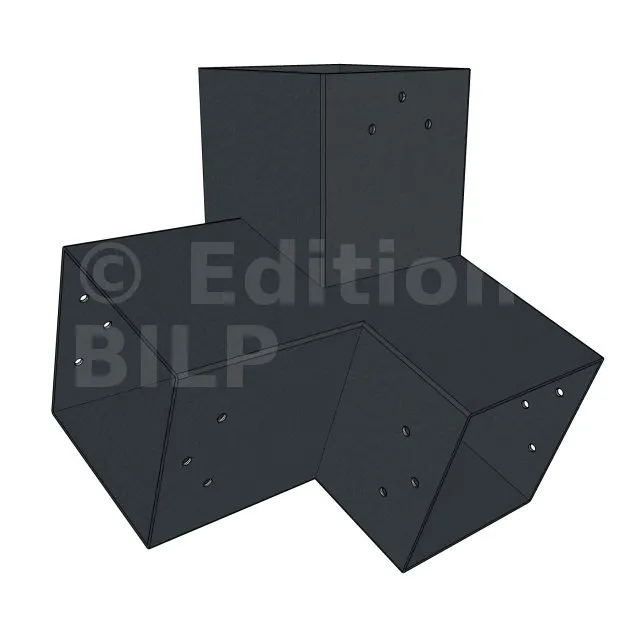 Il est utilisé dans un angle extérieur. Ce connecteur va permettre de raccorder une poutre 120x120mm à une poutre 120x120mm avec une pente de 20°, le tout étant supporté par un poteau vertical 120x120mm.