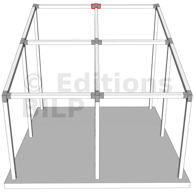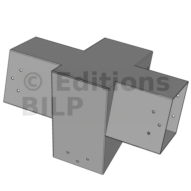 Connecteur d’angle intérieur à quatre directions conçu pour l’assemblage de poutres en section 120x120 mm avec un chevron de même section incliné à 20°. Il assure la jonction structurelle entre les éléments horizontaux, le chevron incliné et un poteau porteur vertical en 120x120 mm.