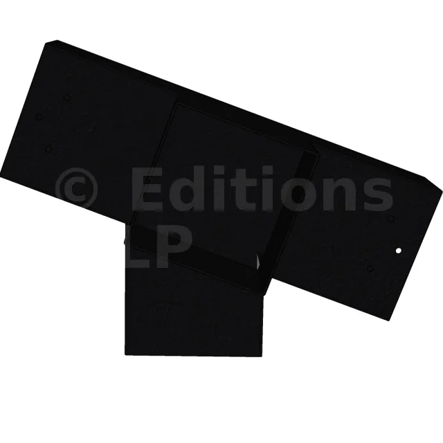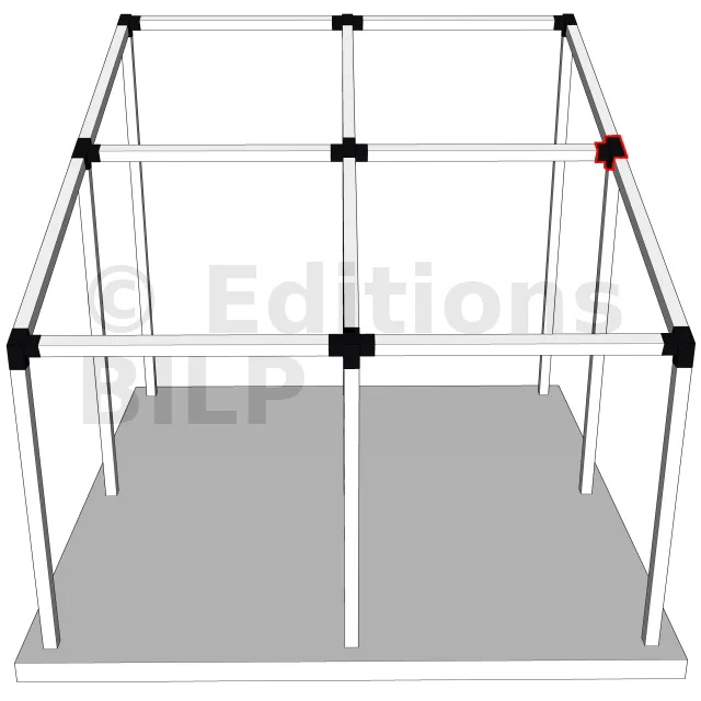 Connecteur d’angle intérieur à quatre directions, conçu pour l’assemblage de deux poutres en section 120x120 mm formant un angle de 20° avec un poteau vertical de même section. Il assure une liaison structurelle rigide et orthogonale à mi-hauteur, garantissant la stabilité de l’ensemble.
