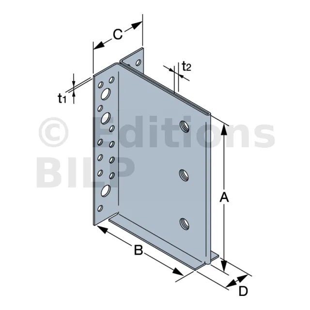 | Largeur | Hauteur | Largeur poteau | Hauteur (A) | Profondeur (B) | largeur (C) | largeur (D) | Epaisseur (t1) | Epaisseur (t2) | Ø13 | Ø5 | Ø13 | ||