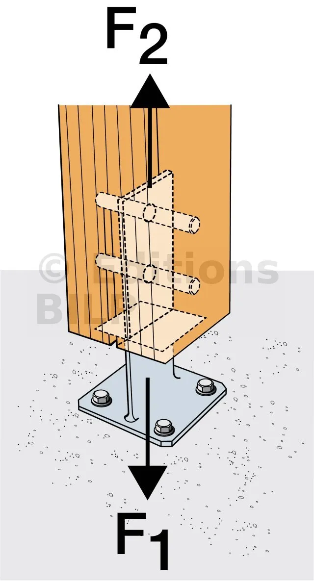 - Connexion bois sur support rigideSur poteau : 2 STD12 ; sur béton : 4Ø10 (goujons WA M10 ; tige filetée M10) ; sur acier : boulons