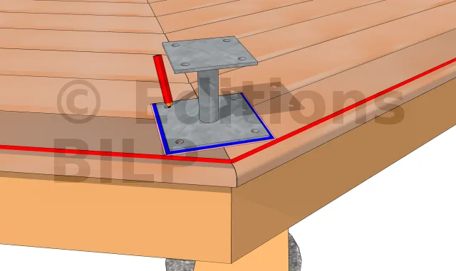 Simuler la position du pied de poteau en vous aidant de cette surface de base du poteau. Repérer les points de fixation du pied de poteau sur le platelage.