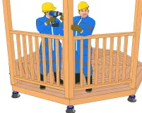 - Avant de fixer les panneaux au platelage, vérifier tout d’abord l’alignement des poteaux et leurs positions par rapport au bord du platelage. Faire le tour et tapoter au maillet pour ajuster.