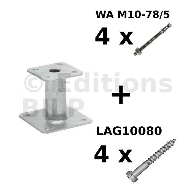 Les vis Ø10x80 pour fixation du poteau peuvent être des tirefonds LAG 10x80 ou vis SSH Ø10x80 (ref 75152).