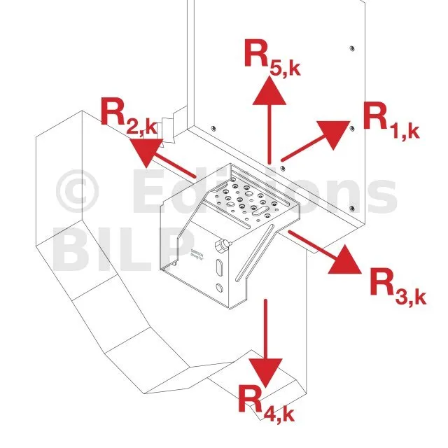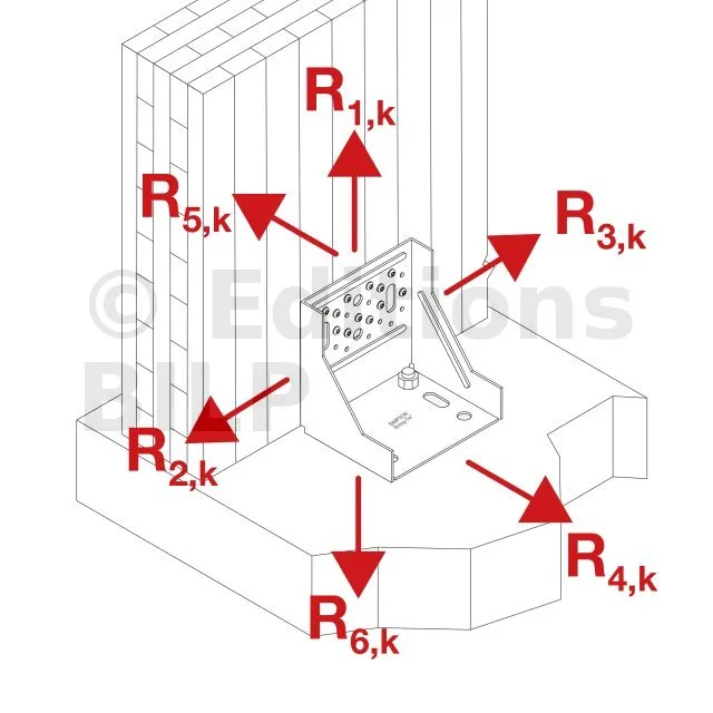 Les résistances données dans ce tableau sont des résistances maximum. Il convient de vérifier la reprise de charge des ancrages. Si les ancrages n’ont pas une capacité suffisante, les charges de l’ACW155 doivent être réduites. De même, si la fixation à l’élément bois est réalisée avec des boulons ou des tirefonds, il faut alors vérifier que la charge puisse être reprise par ces fixations.