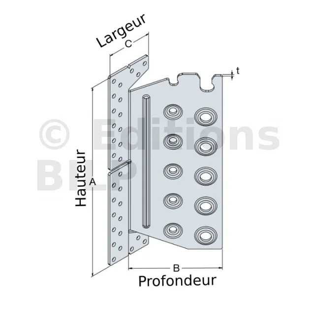 | Largeur | Hauteur | Largeur poteau | A | B | C | t | α [°] | Ø5 | Ø8,5 | Ø12,5 | ||||||