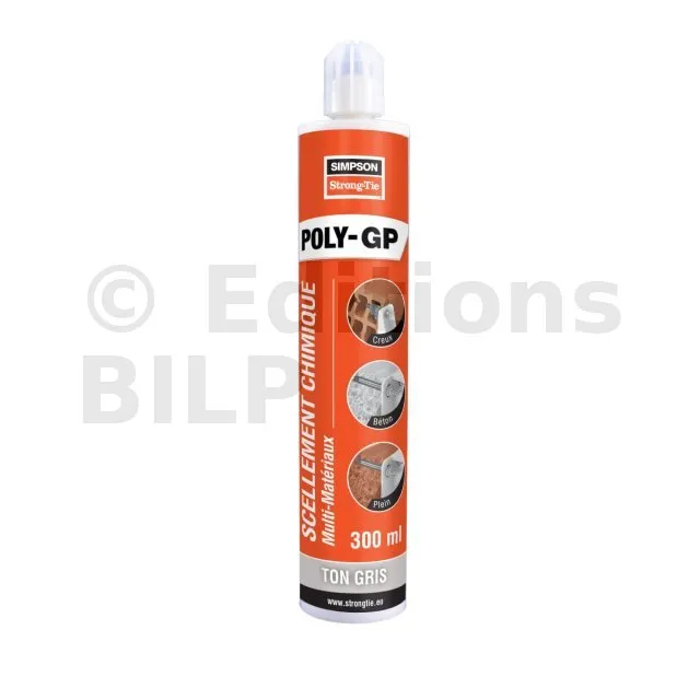 La résine multi-matériaux POLY-GP est un ancrage chimique permettant de fixer les tiges filetées dans le béton C20/C25 à C50/60 et toutes les maçonneries creuses et pleines.