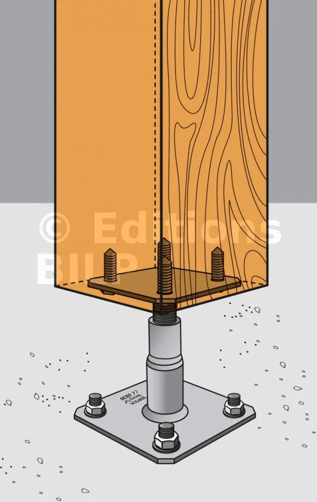 - Fixation des éléments bois (chevrons, solives, poteaux, etc) sur platines métalliques.