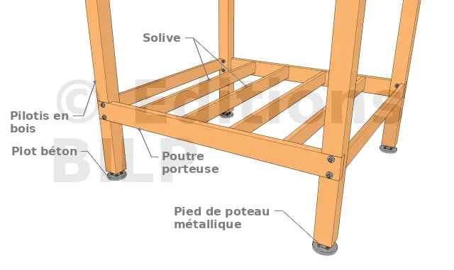 Dans ce cas, les poutres porteuses de la plateforme sont directement fixées sur les pilotis par système d’encoche ou boulonnage. Les pilotis eux-mêmes sont fixés sur des plots en béton par des pieds de poteau.