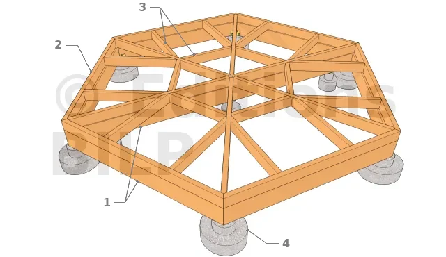 Pour le cas d’une plateforme polygonale, on fait généralement appel à la structure sur poutres porteuses. Quand le terrain présente une faible pente, les plots en béton formeront un ensemble à niveau pour pouvoir fixer les poutres. Ainsi, la plateforme sera à une hauteur suffisante et préservée de l’humidité.