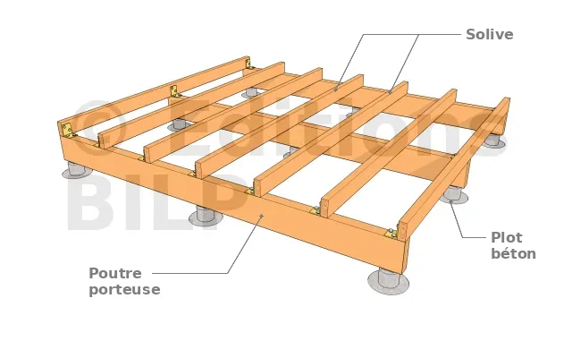 Avec une plateforme en bois sur poutres porteuses, la hauteur de la plateforme est réduite à une ou deux marches selon les dimensions des poutres porteuses et solives. La structure est soutenue directement par des plots en béton supportant les poutres porteuses.