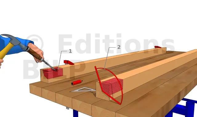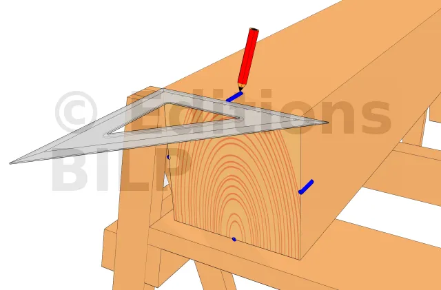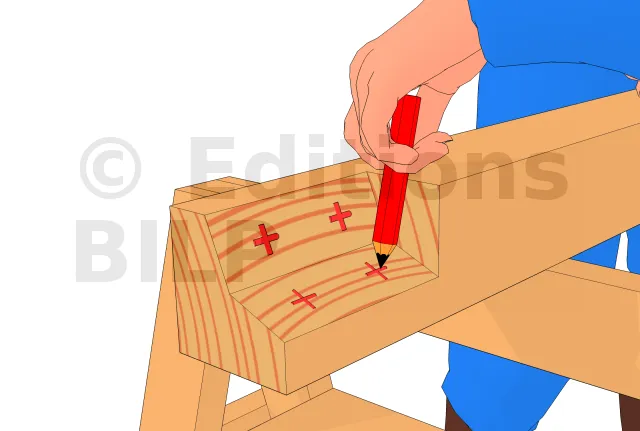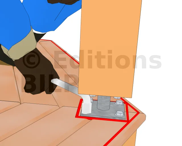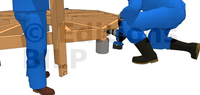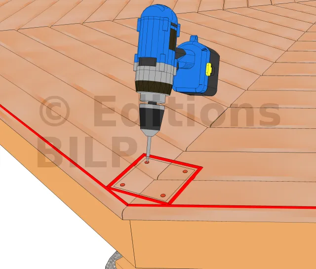 Simuler la position du pied de poteau en vous aidant de cette surface de base du poteau. Repérer les points de fixation du pied de poteau sur le platelage.