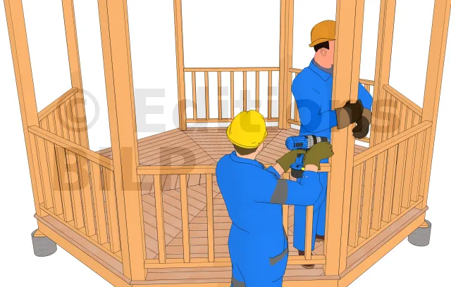 Contrairement à la structure à panneau, la structure sur poteau consiste à monter tous les éléments sur des poteaux, il y aura donc un seul poteau sur chaque coin du polygone avec une section plus importante que les deux poteaux accolés d’une structure à panneau.