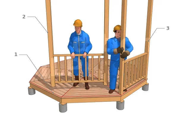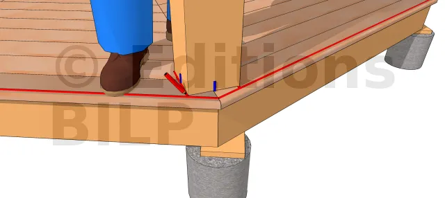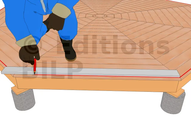 Repérer sur le platelage les positions des poteaux. Prendre en premier lieu les distances par rapport aux coins du polygone. Tracer ensuite les côtés de ce polygone de repère en joignant les points précédents. Placer les deux premiers panneaux en positionnant leurs deux poteaux adjacents suivant les diagonales du platelage et des lignes de repère.