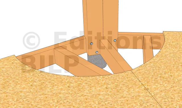 La fixation d’un poteau à l’intérieur se fait de la même manière que pour un poteau à l’extérieur. La différence est que le poteau est fixé sur les faces internes des poutres porteuses ou des solives externes et traverse ainsi le platelage.