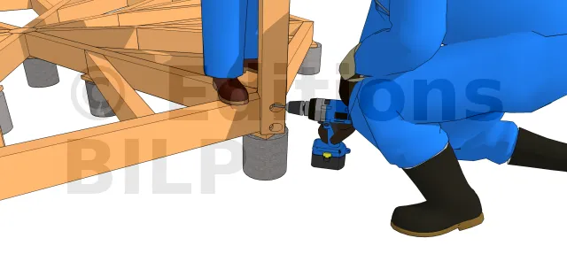 La fixation de poteaux sur le platelage est réservée pour une structure à panneau ou bien une structure sur poteau avec une plateforme à section portante importante. On suppose dans ce montage que les points de fixations des poteaux et pieds de poteau sont aux droits des poutres porteuses ou des solives portantes.